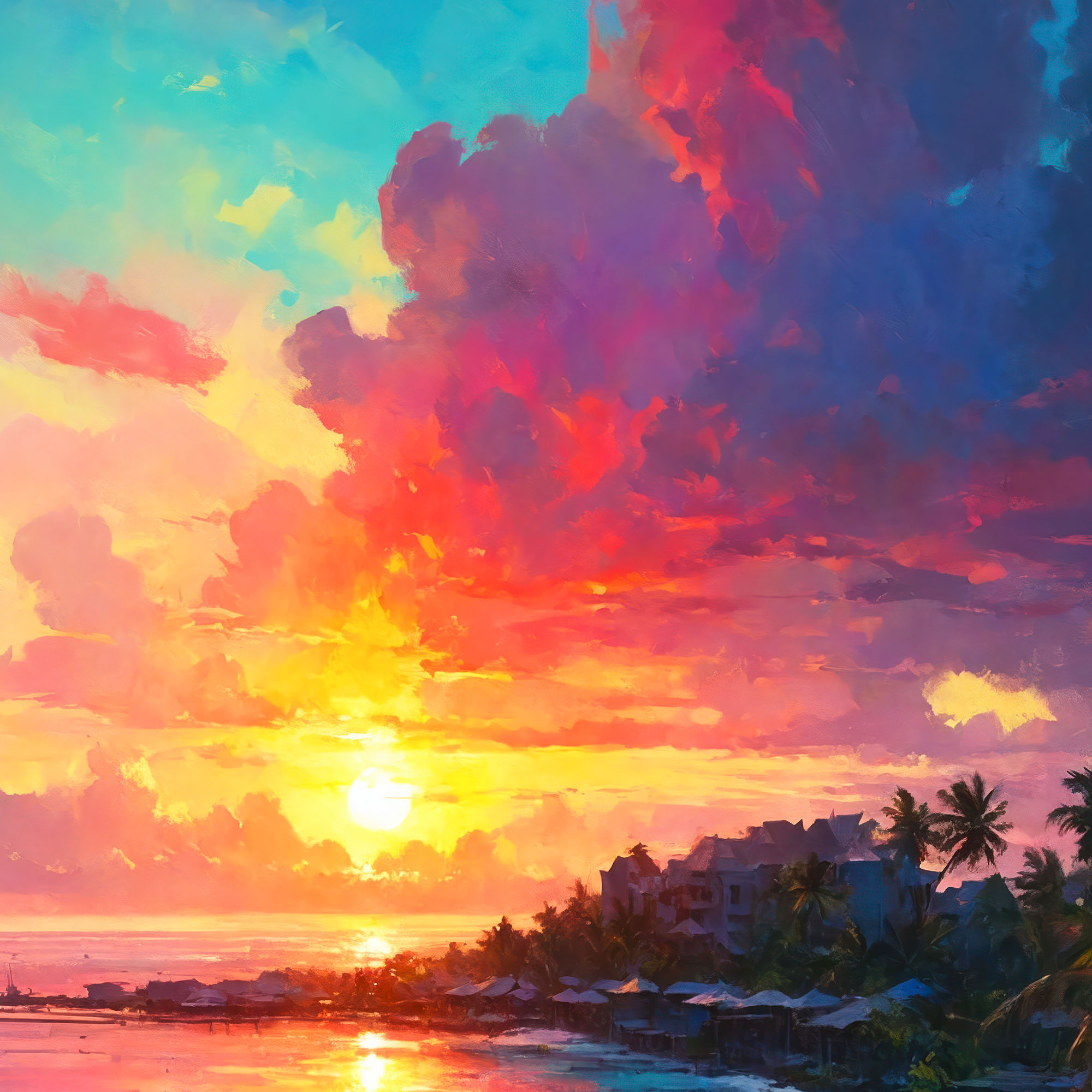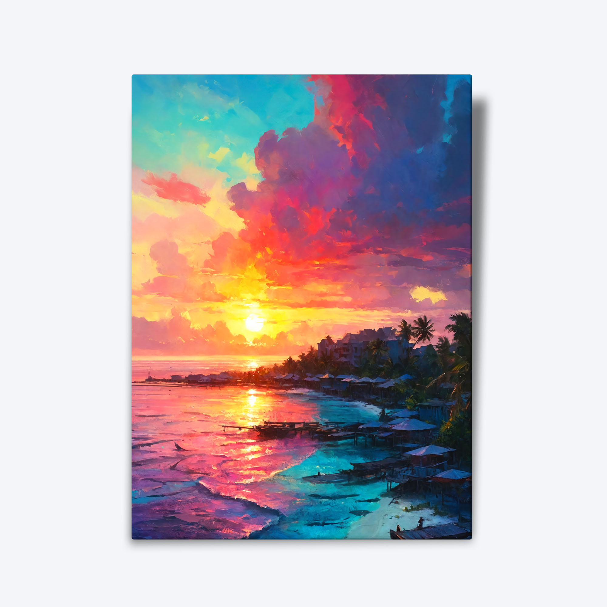 Îmbogățește-ți spațiul cu tabloul „Apus în Maldive”, o capodoperă picturată care surprinde un peisaj idilic din insulele Maldive la un apus de soare glorios. Culorile puternice și contrastul vibrant aduc la viață farmecul și euforia eforturilor tropicale, oferind o experiență vizuală de neuitat.