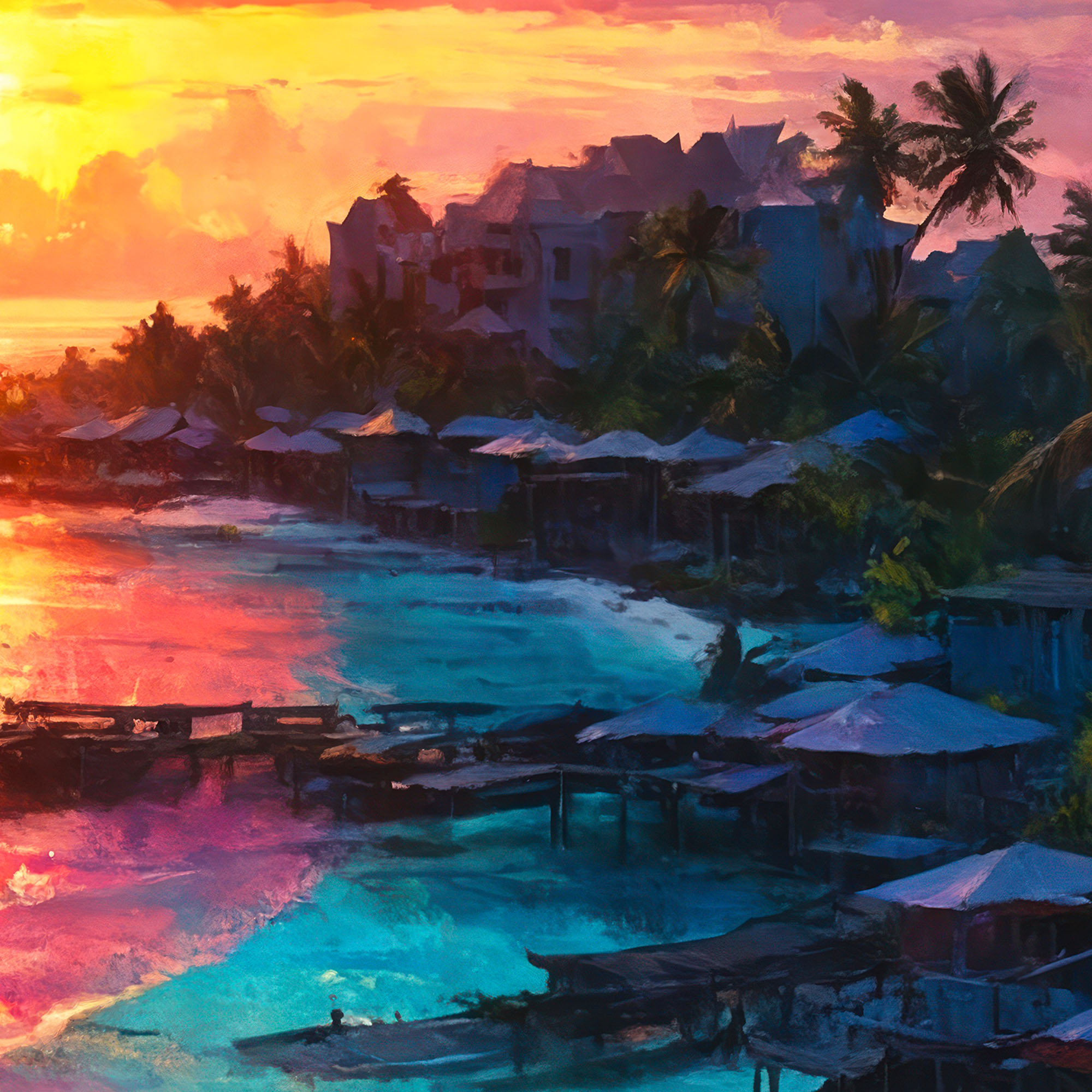 Cu o abordare grunge în stilul său, acest tablou peisaj reprezintă un veritabil omagiu adus frumuseții naturii într-o formă artistică contemporană. Apusul în Maldive este transpus într-o paletă cromatică plină de viață, reflectând magia și misterul peisajelor tropicale.
