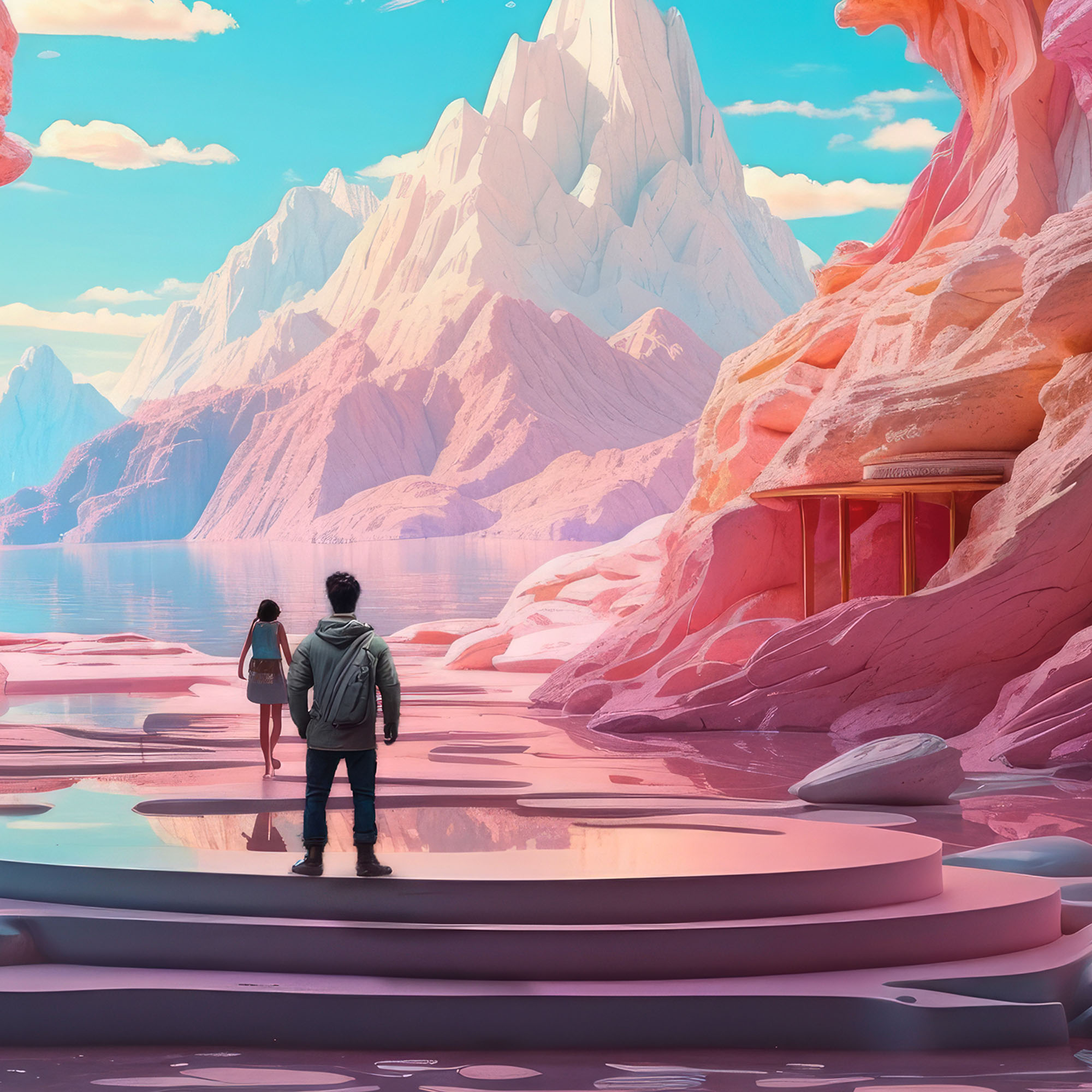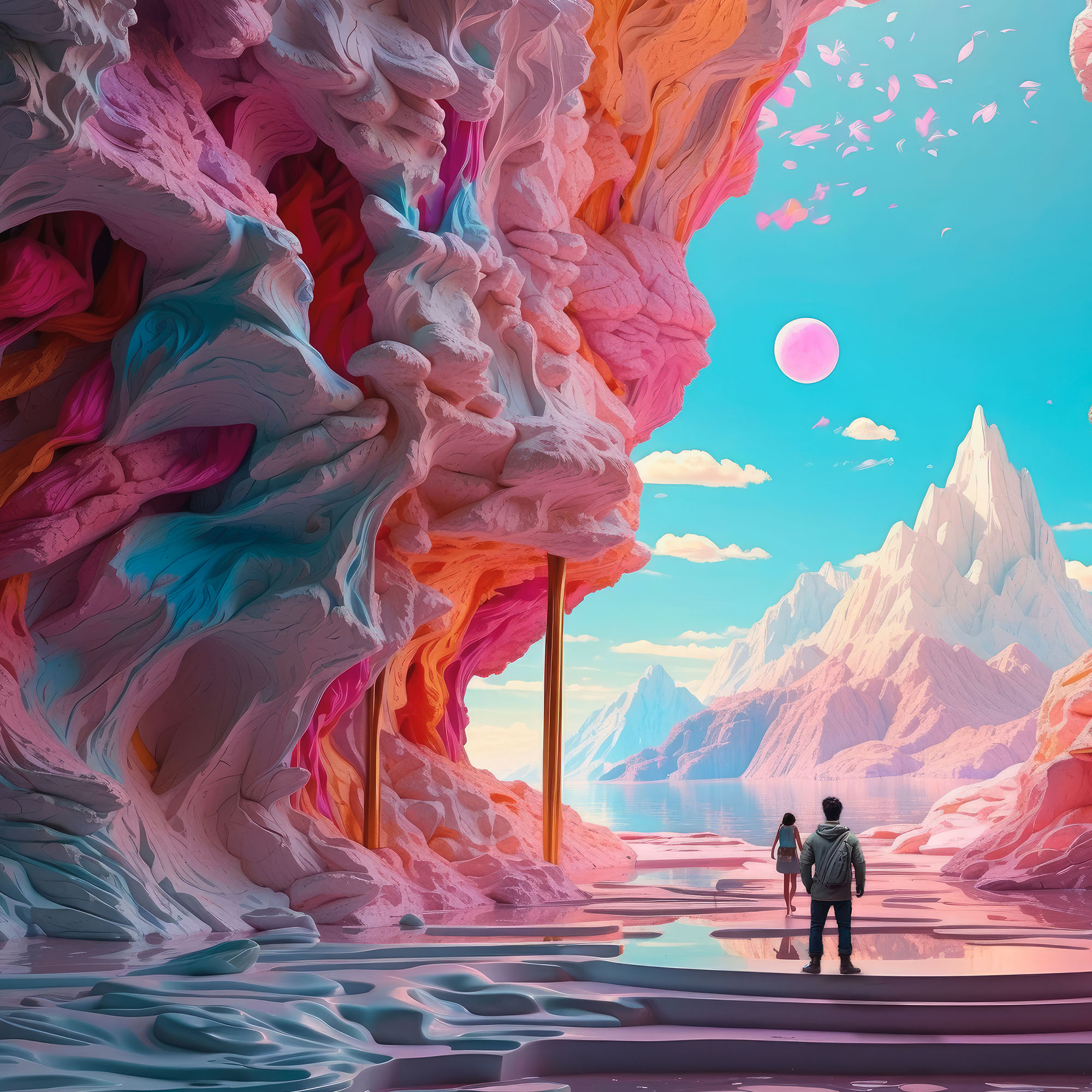 În tabloul „Bubble Gum”, un cuplu curios explorează un peisaj surreal, a cărui culori vibrante amintesc de guma de mestecat. Lucrarea surprinde momentul captivant al descoperirii, într-o lume unde realitatea și imaginația se întâlnesc.
