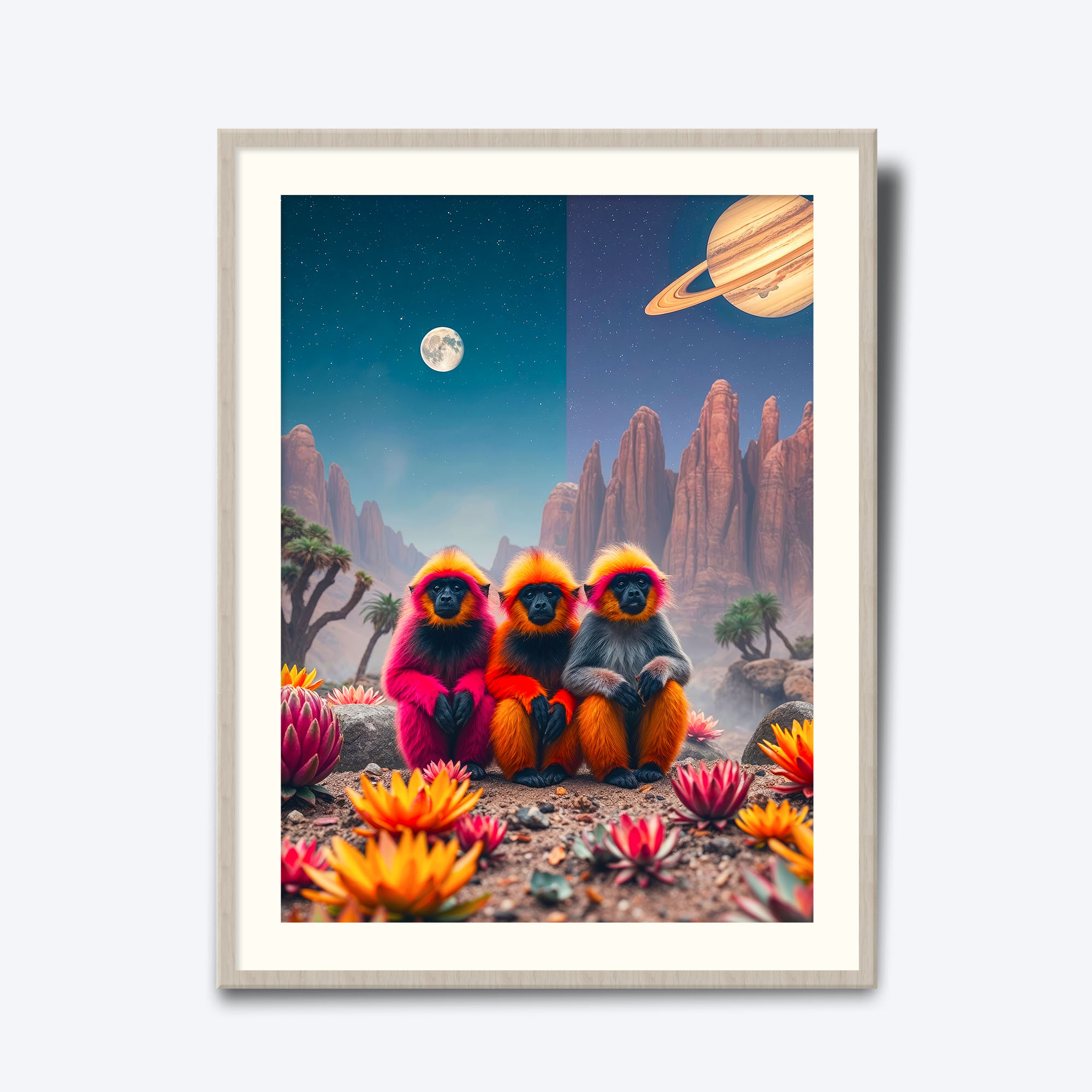 Tabloul „Ce? Cum? Unde?” te invită într-o călătorie într-un peisaj extraterestru, unde trei maimuțe mici stau aliniate, observând cu uimire lumea din jurul lor. Fiecare detaliu din acest colaj fotografic conceptual te îndeamnă să explorezi noi perspective și să te pierzi în universul lor misterios. Acest tablou oferă un punct focal captivant și enigmatic, perfect pentru cei care adoră decorurile neconvenționale.