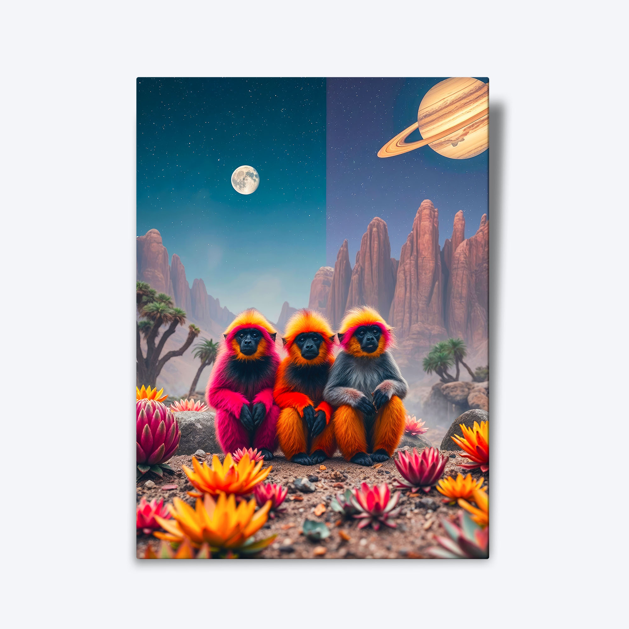 Tabloul ‘Ce? Cum? Unde?’ combină un peisaj extraterestru cu trei maimuțe curioase, creând o operă de artă conceptuală în culori vibrante. Ideal pentru sufragerie, dormitor, hol sau birou, acest tablou adaugă mister și originalitate oricărui spațiu.