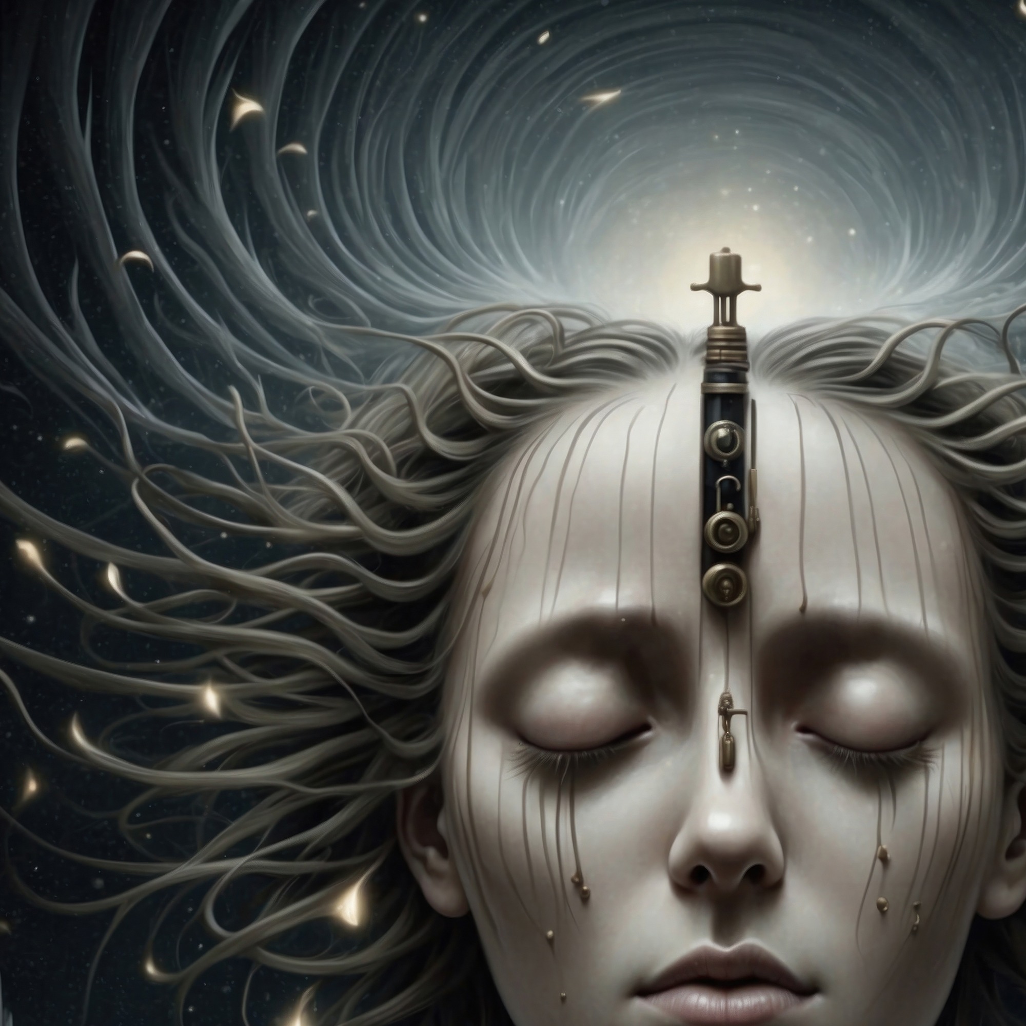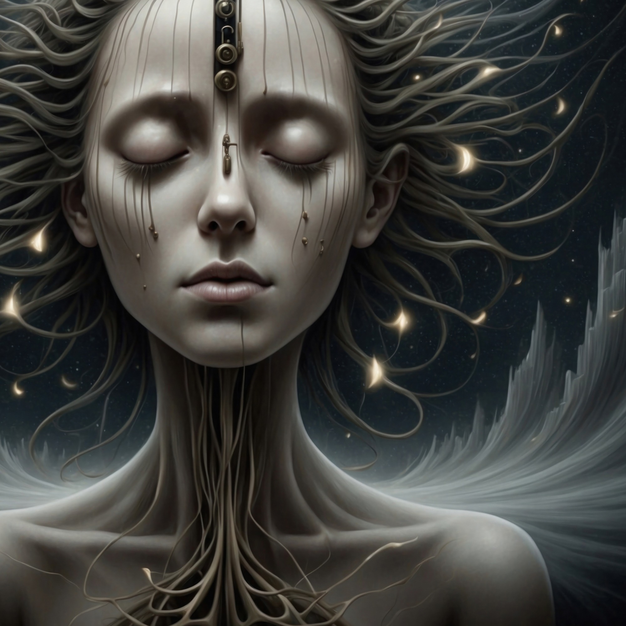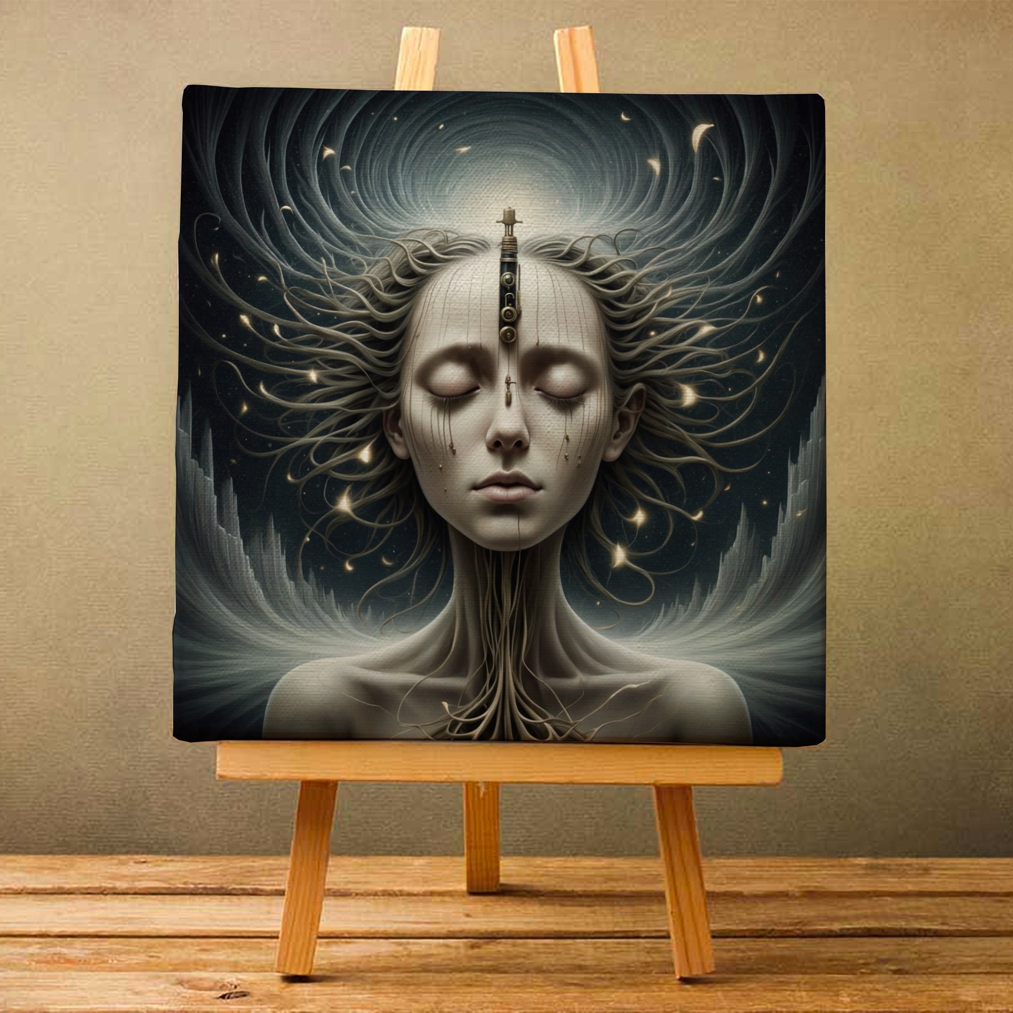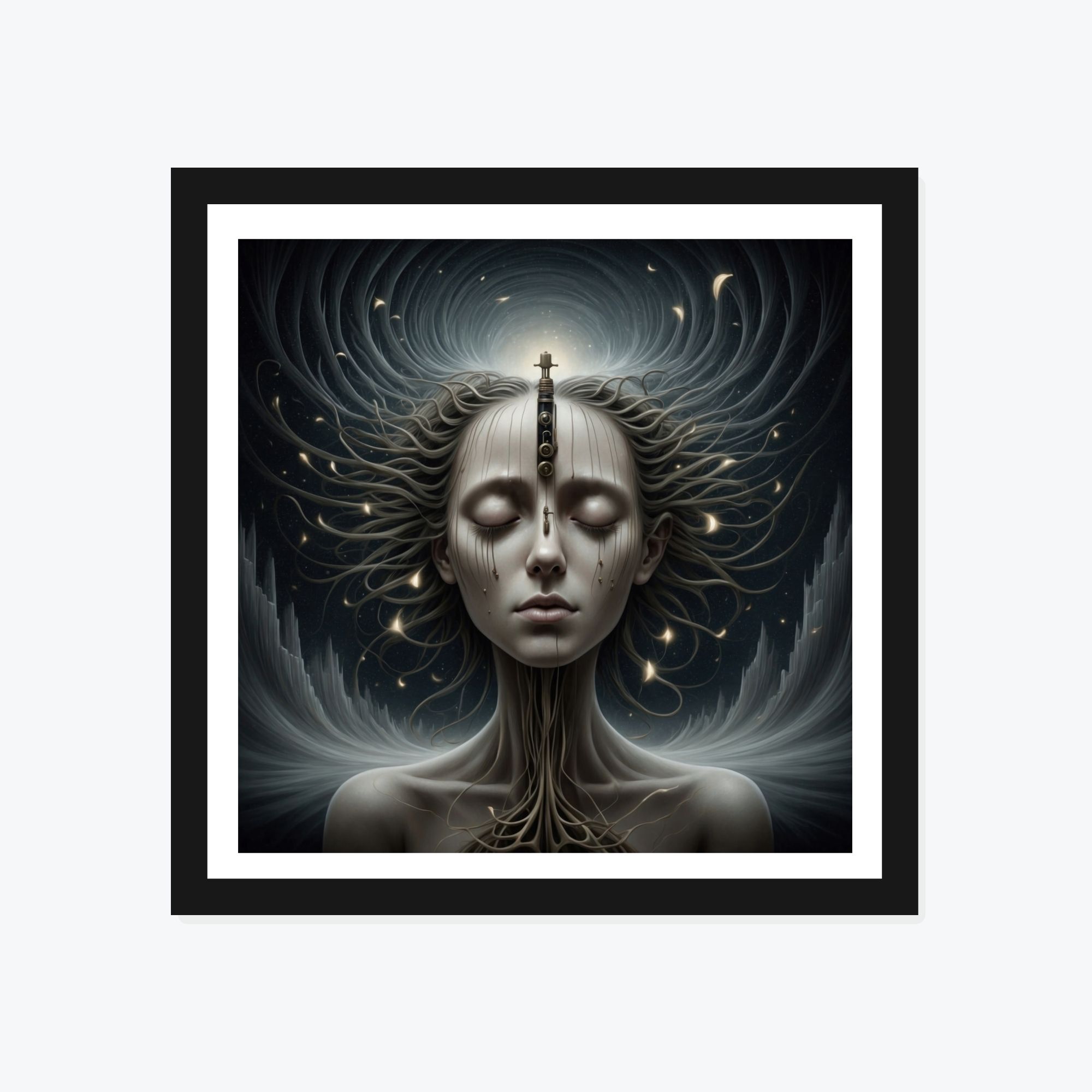 Descoperă tabloul ‘Conectată’, o lucrare ce ilustrează o femeie într-o transă, conectată la univers ca într-o rețea de neuroni. Într-un stil neo-gotic întunecat, acest tablou conceptual te invită să explorezi tărâmurile misterioase ale minții umane.