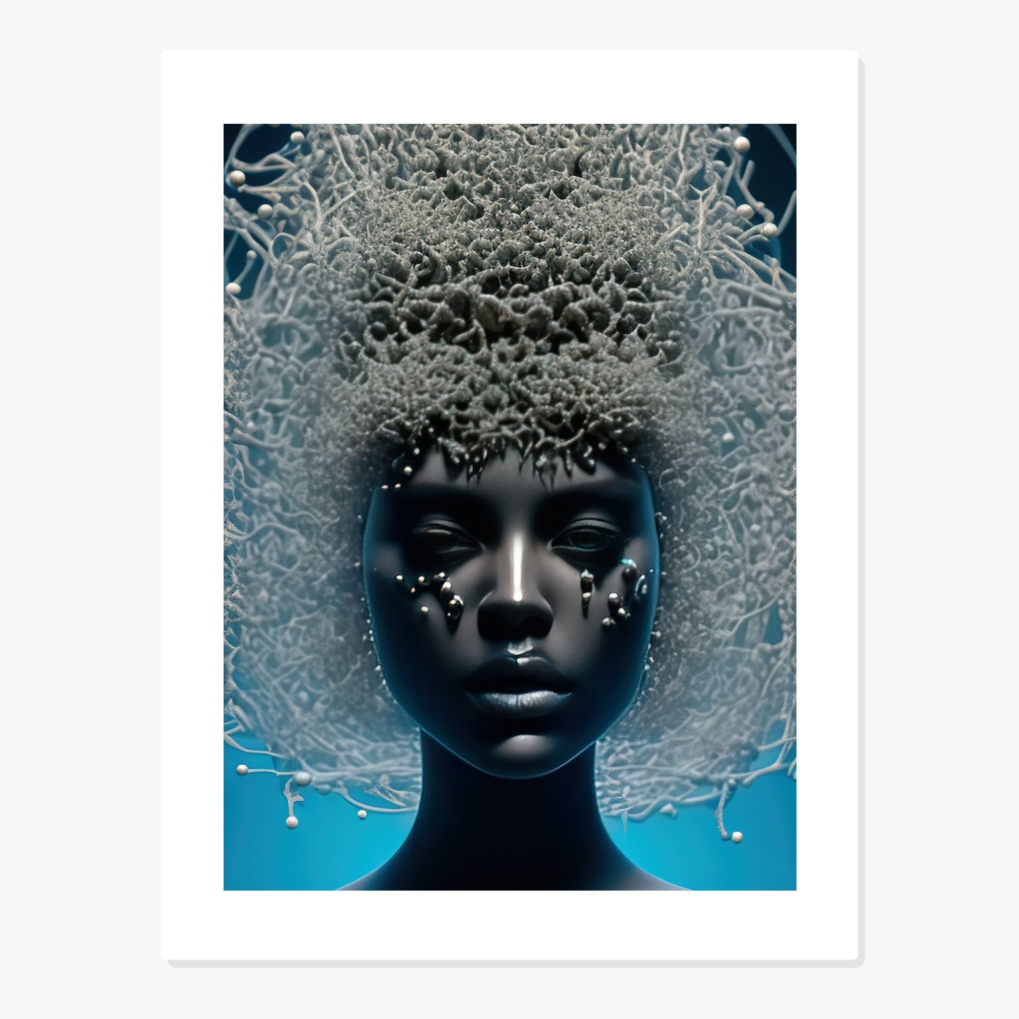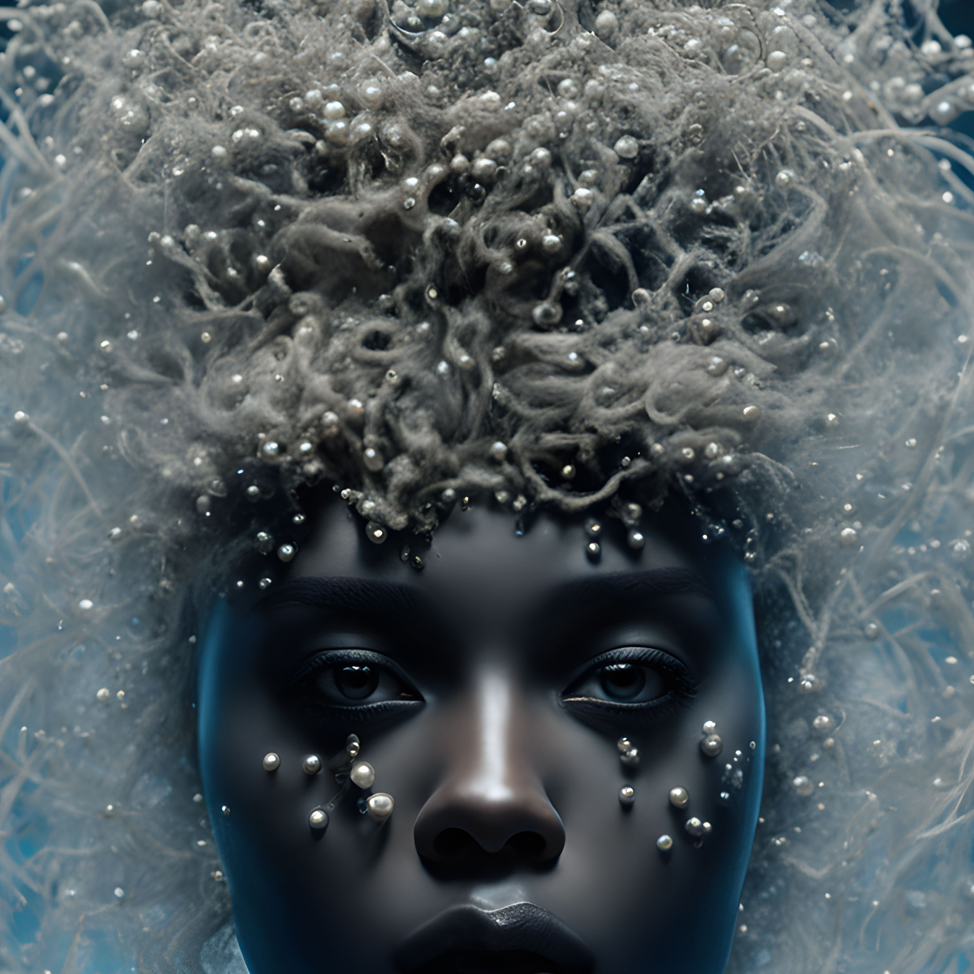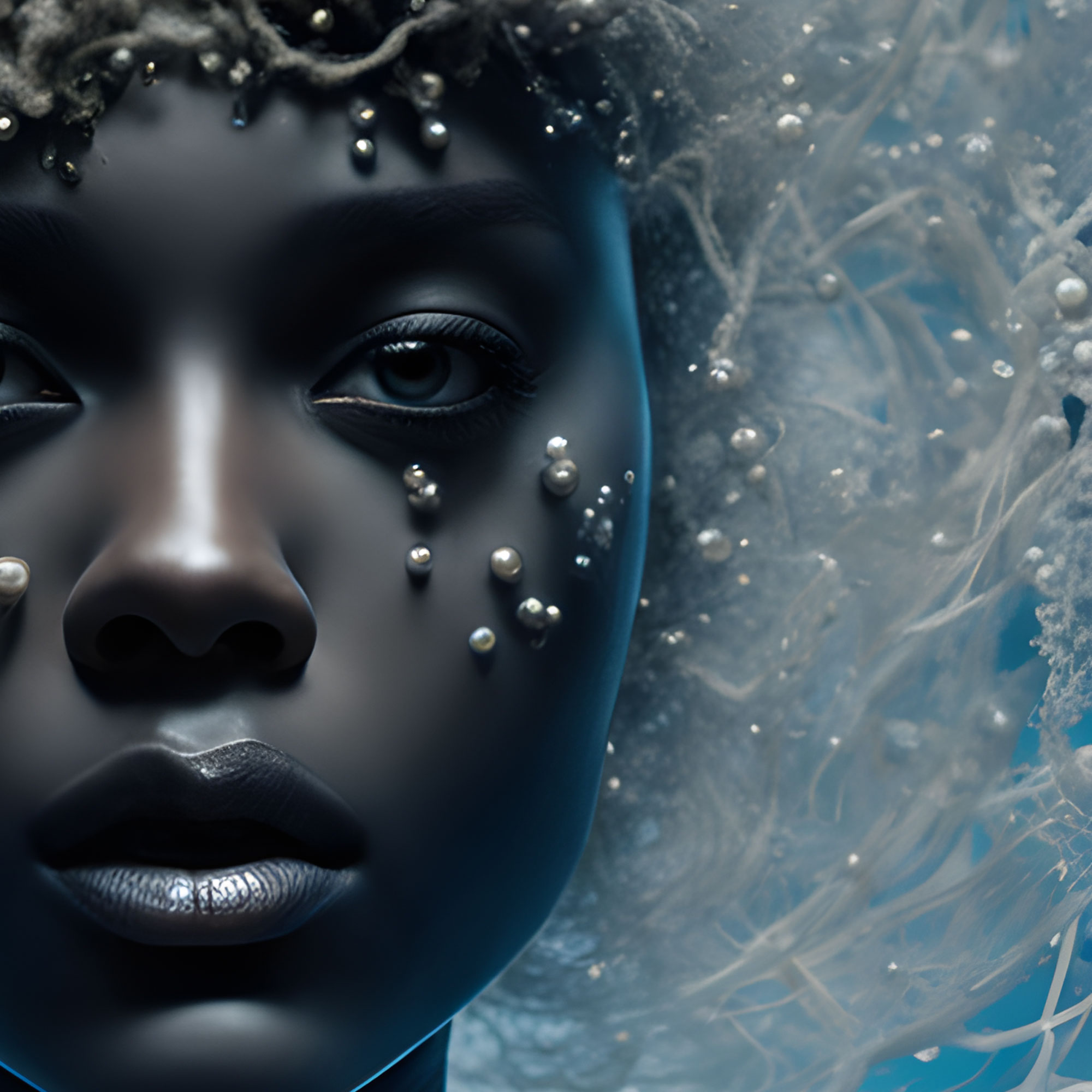 Lacrimile de perle, care se preling suav pe obraji, adaugă un element de melancolie și puritate. Aceste simboluri delicate îmbrățișează dualitatea zeiței – întunericul și lumina, tristețea și noblețea – alcătuind un portret complex și emoționant.