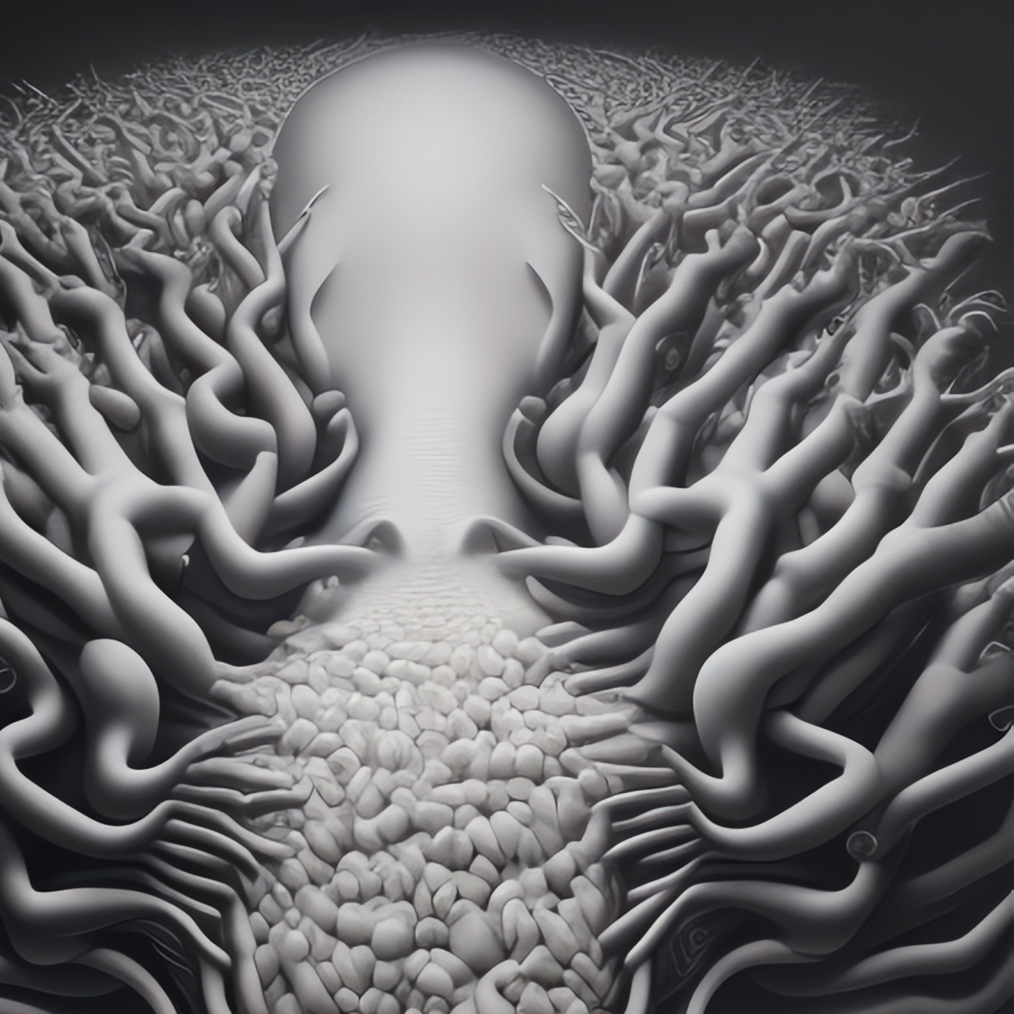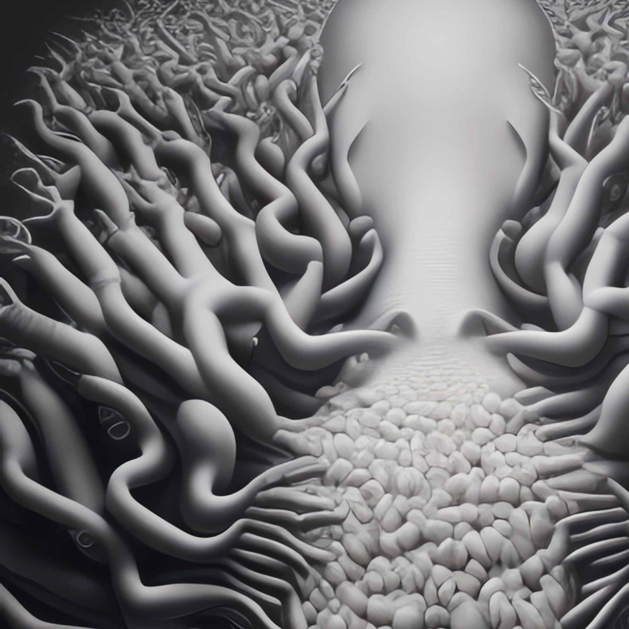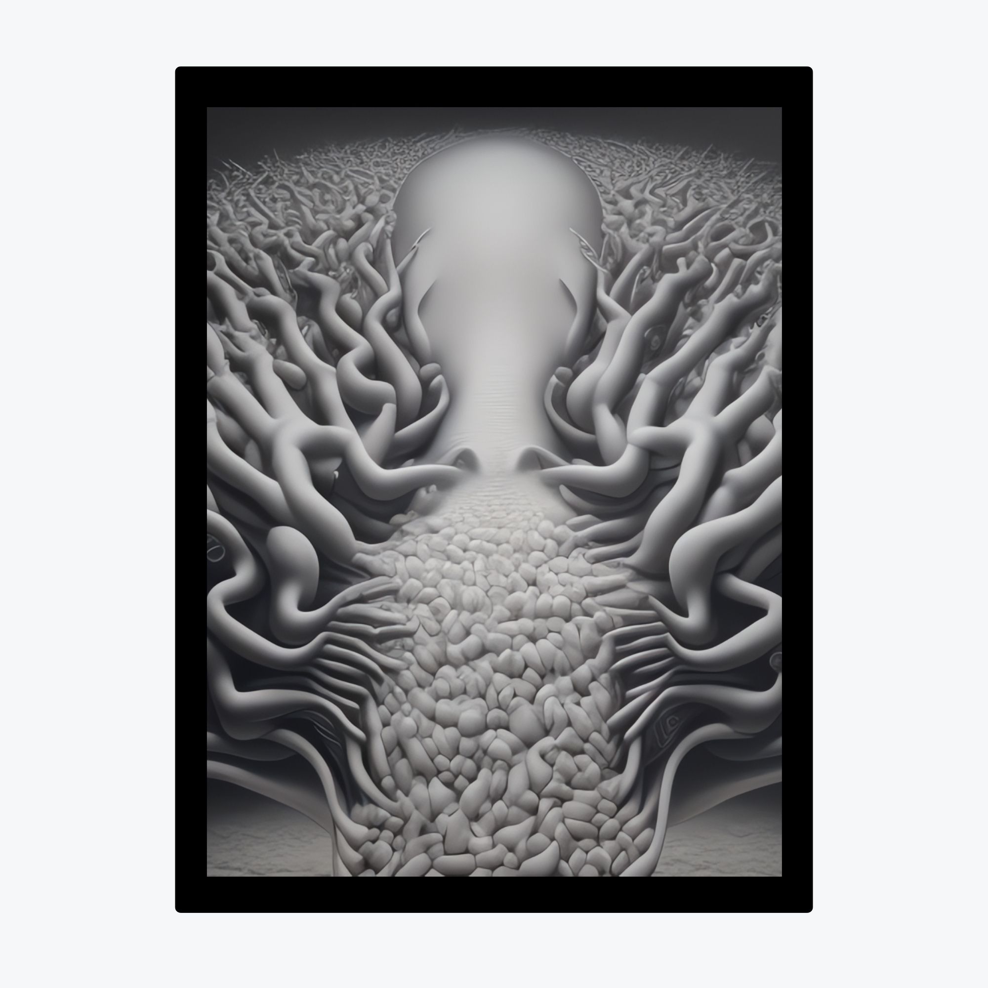 Paleta de alb și negru intensifică atmosfera misterioasă și adaugă o notă dramatică. Fiecare umbră și contur conturează o poveste complexă, sugerând că această pădure umană poate ascunde în ea întregi narațiuni despre identitate și conexiune.