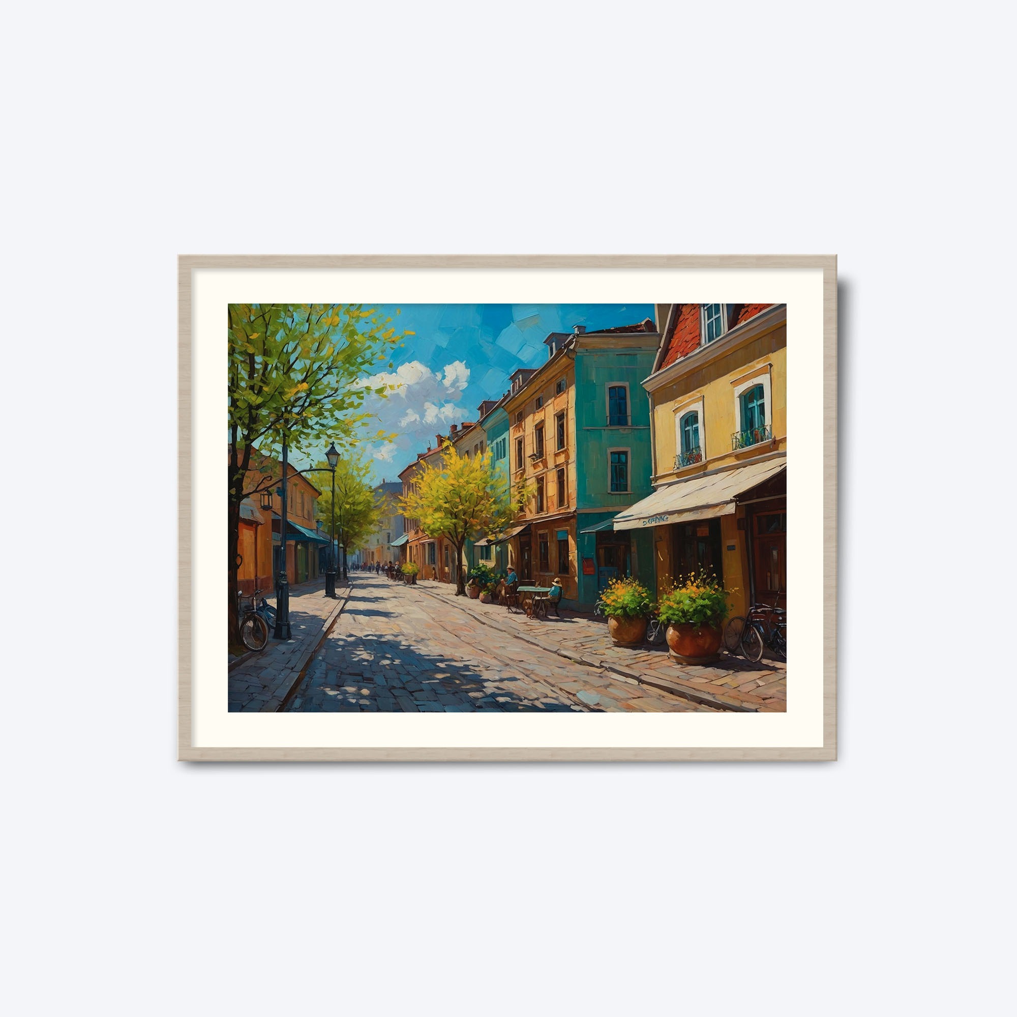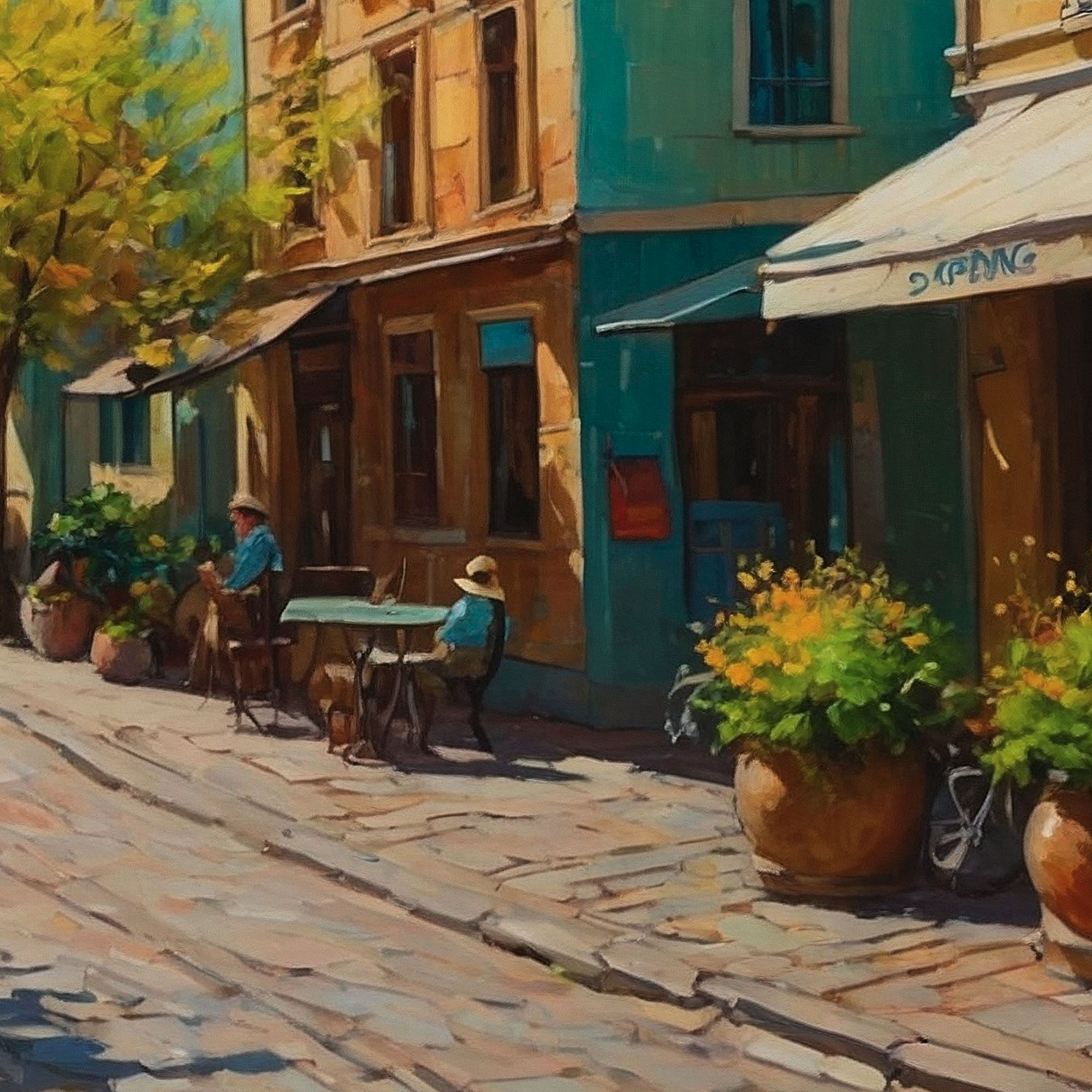 „Primăvara în Oraș” te transpune într-un peisaj urban plin de farmec, unde străzile încălzite de soare se îmbină armonios cu vibrația vieții de oraș. O cafenea micuță adaugă o notă de intimitate și căldură în acest tablou plin de detalii captivante.